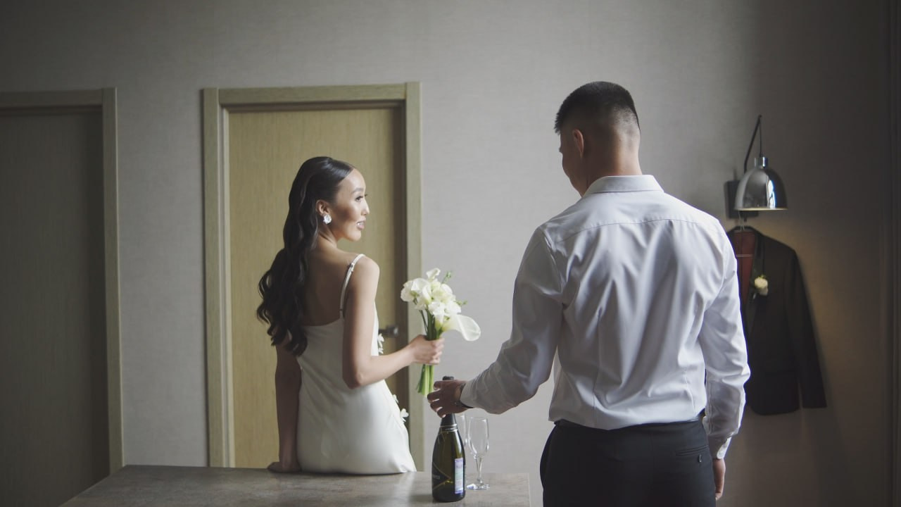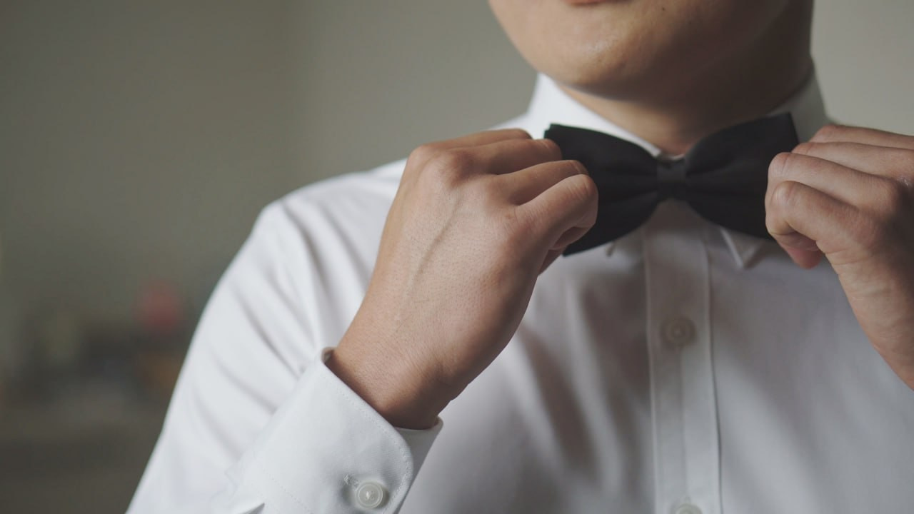 Съёмка аксессуаров жениха: ремень, часы, бабочка — жених завязывает бабочку, надевает пиджак. Брутальные кадры жениха делаются в тёмном ключе, либо на тёмном однотонном фоне фотостудии. Если настроение весёлое и приподнятое, то в светлом ключе.